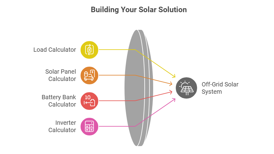 The Off-Grid Solar Calculator uses standard industry formulas to help you size your solar system accurately. Here's how each section calculates your results: